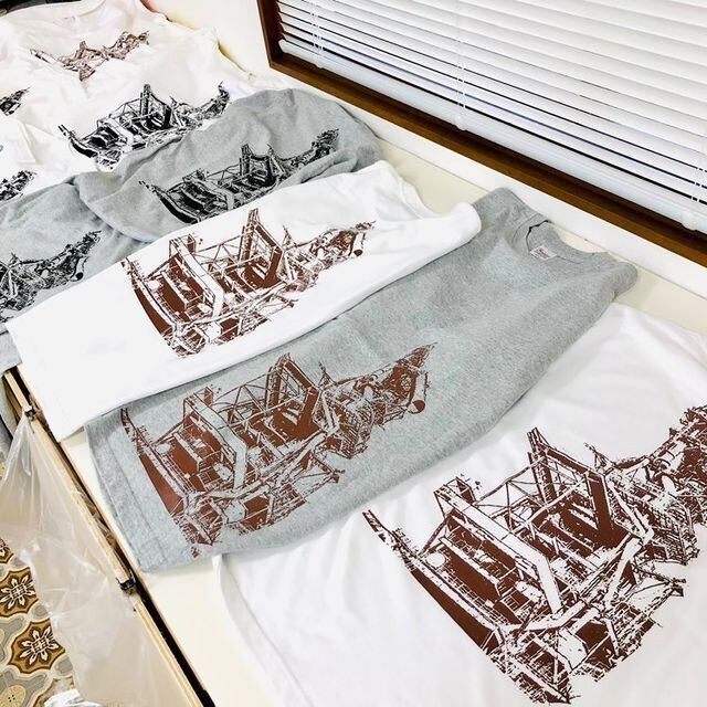 グレーの10分袖のTシャツにシルクスクリーンで、錆び色高炉のプリントを施しました。左の脇腹辺りです。背後はうなじの下辺りにw_tanks_のロゴも入っています。レイアウトの関係上、サイズはXLのみの展開といたします。ご容赦ください。
